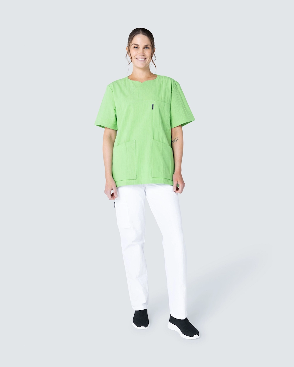 Busseronnen er i en lige unisex model med praktiske og rummelige lommer, der har masser af plads til arbejdsredskaber. Hoftelommerne har en mobillomme og nøglerem, hvor du nemt kan vedhæfte nøgler eller ID-kort. Busseronnen har en rund v-udskæring, som giver en flot detalje. Med slids i siden får du masser af bevægelsesfrihed. Busseronnen er lavet af crinkled bomuld, hvilket giver en luftig og behagelig fornemmelse. Det crinkled stof reducerer også behovet for pleje, såsom strygning.