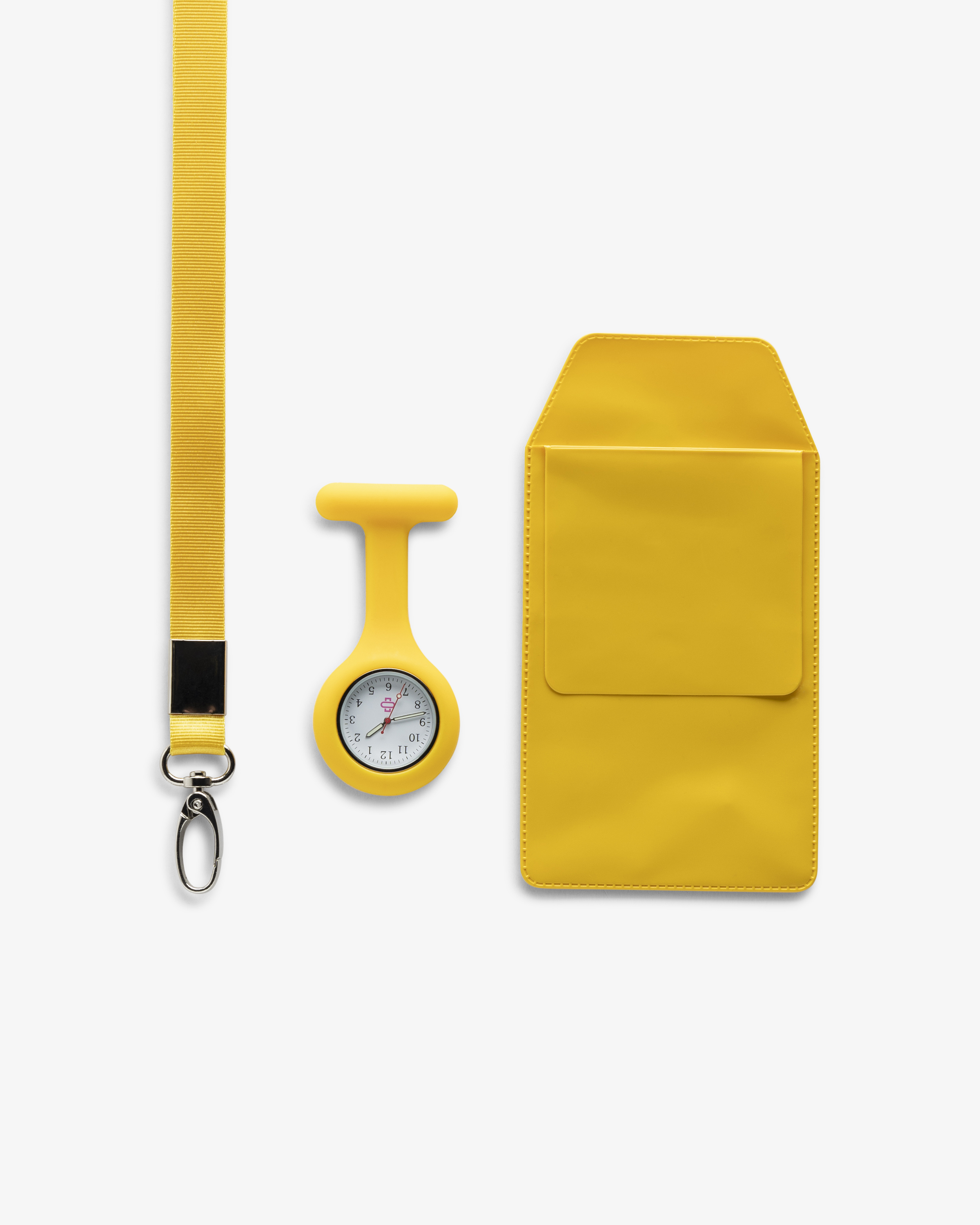 Et friskt og praktisk sæt med arbejdstilbehør i en dejlig gul farve. Sættet indeholder en matchende silikoneur, nøglesnor og penlomme – alt i et solrigt og energigivende design, der sætter farve på din arbejdsuniform og hjælper med at holde orden på dine ting.