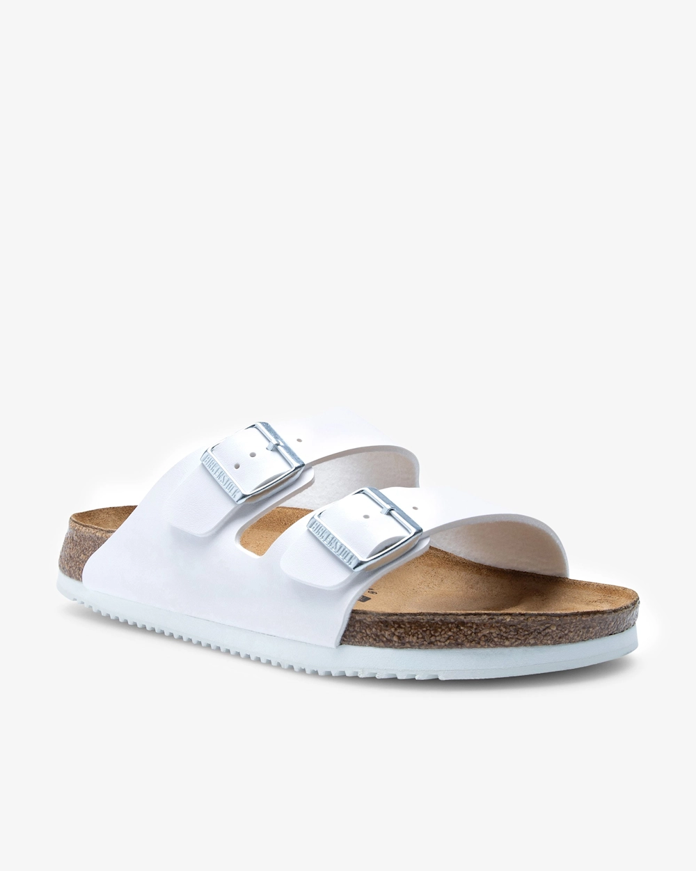 Birkenstock Arizona fra Proffesionals-serien udmærker sig ved Super-Grip-ydersålen. Som forhindrer skridning og er olie- og fedt afvisende. Samtidig har den Arizonas mest berømte kendetegn. Med en dæmpende EVA mellemsål og en anatomisk designet fodseng.