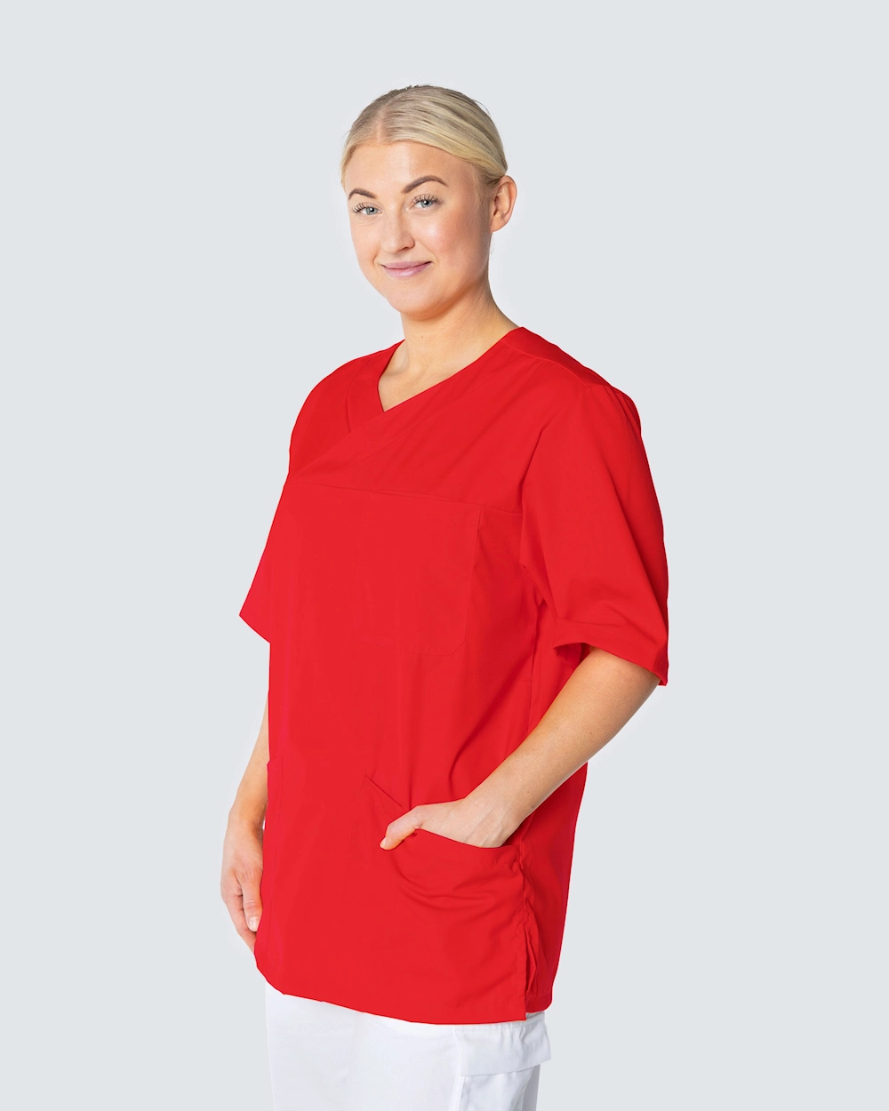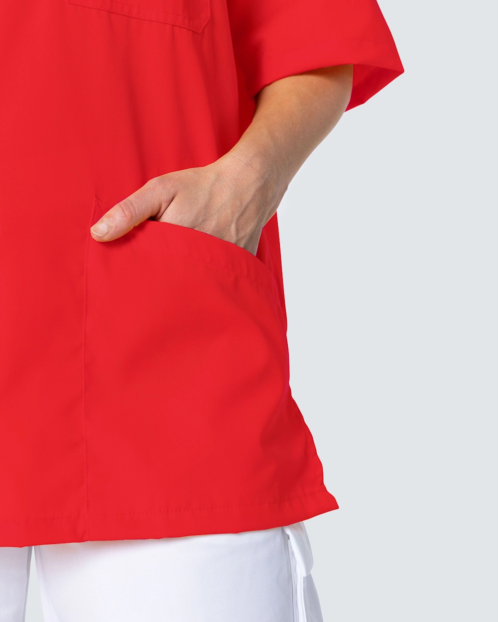 Komfortabel og rummelig busseronne i polyester/bomuldsblanding. Med praktiske og rummelige lommer har du nemt plads til det, du har brug for på arbejdet. De to lommer foran er skrå, hvilket giver en flot detalje på busseronnen.