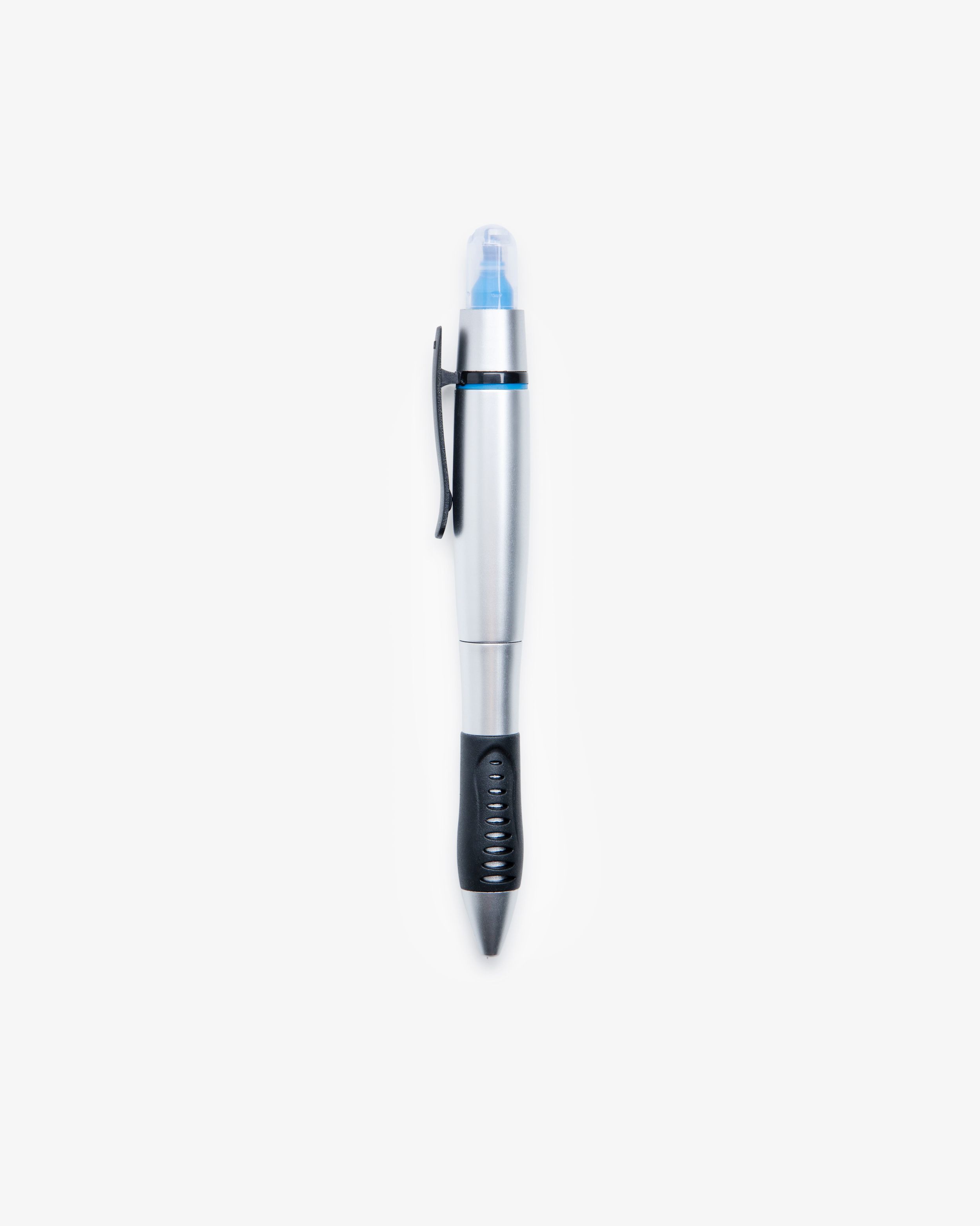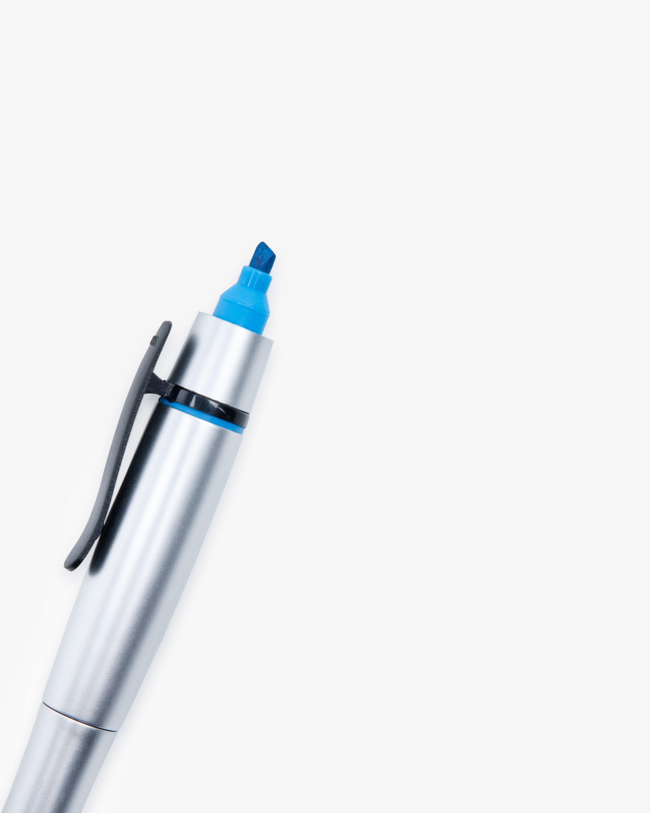 Praktisk 2-i-1 Kuglepen. I den ene ende har kuglepennen sort blæk og i den anden en highlighter i lyseblå.