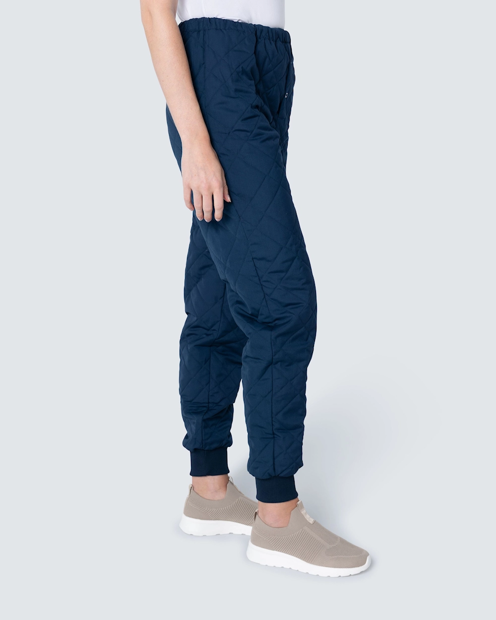 Funktionelle quiltede termobukser med elastisk linning. Bukserne lukkes med gylp og trykknapper og har manchetter ved anklerne.