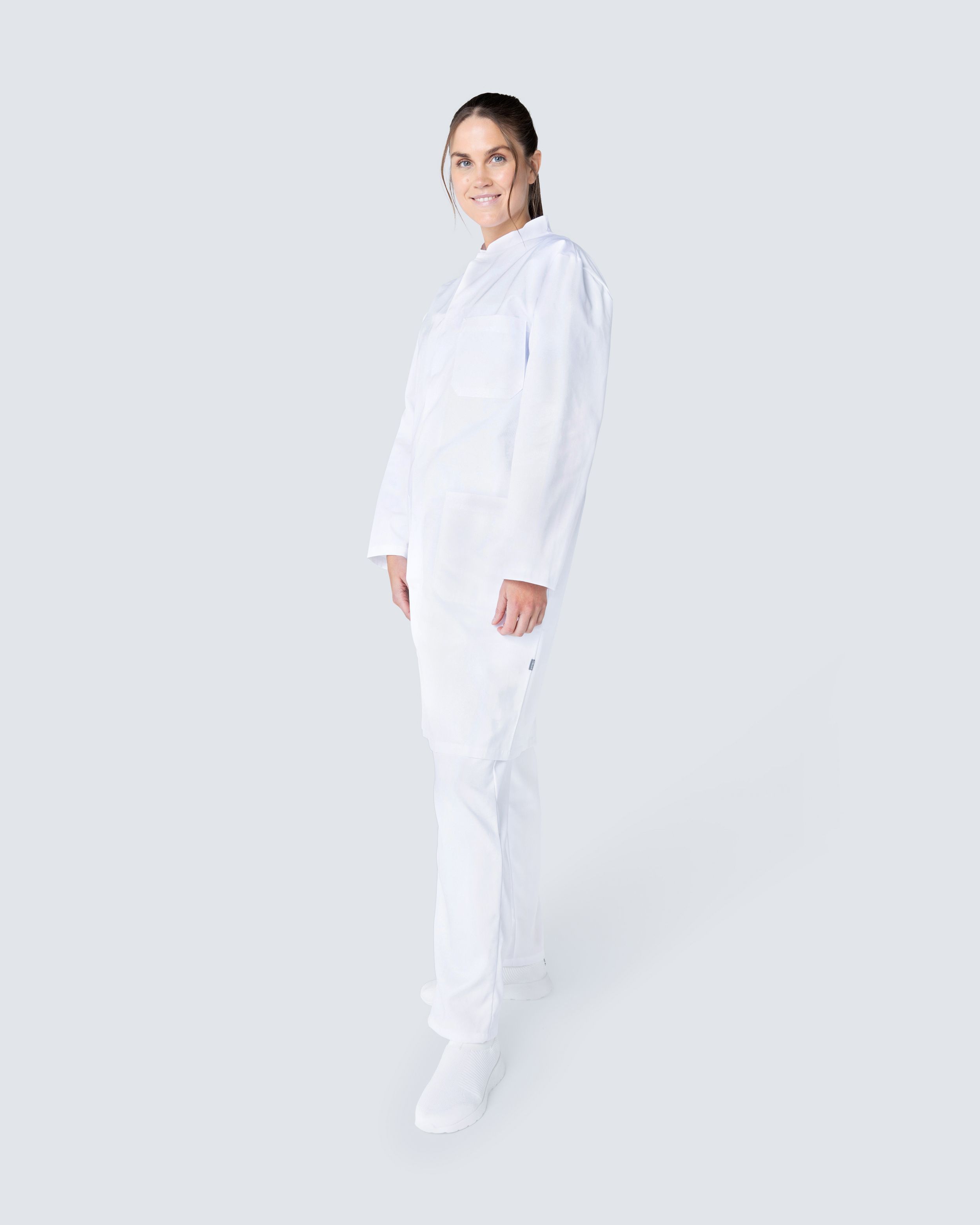 Lægekittel i lige unisex model med praktiske og rummelige lommer. Kitlen har en dekorativ ståkrave og en skjult knaplukning.