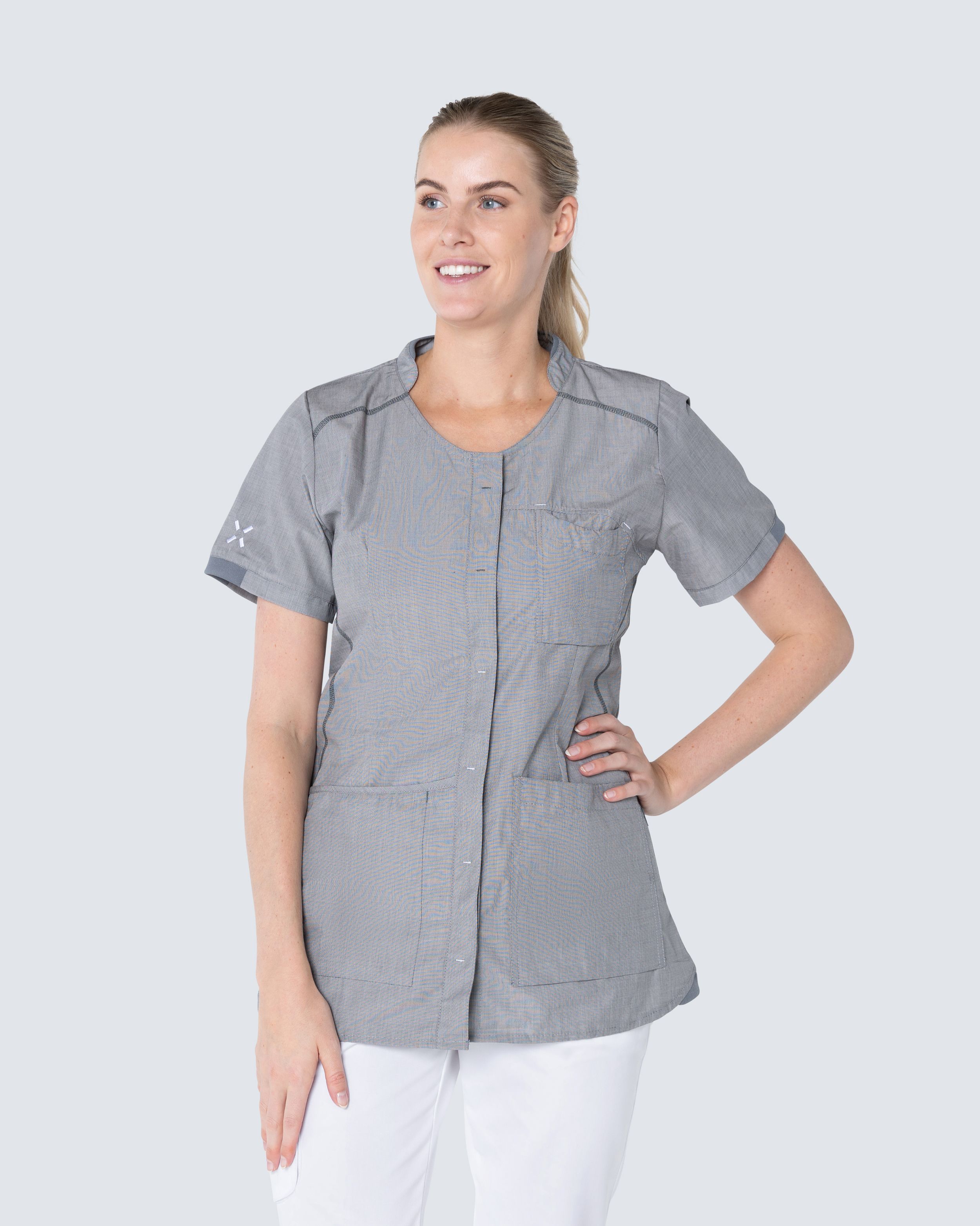 Let taljeret dameskjorte med mulighed for ekstra taljering via smart juste-rings effekt i ryggen. Skjorten har en god rummelig  brystlomme, og begge hoftelommer har nøglestropper og integrerede mobillommer. Samtlige lom-mer er med trykknapper, så der er styr på indholdet. Skjorten har en længde, der dækker godt bagtil ved buk og løft. Modellen har desuden  en rundet bund med rib i siderne for ekstra fleksibilitet.