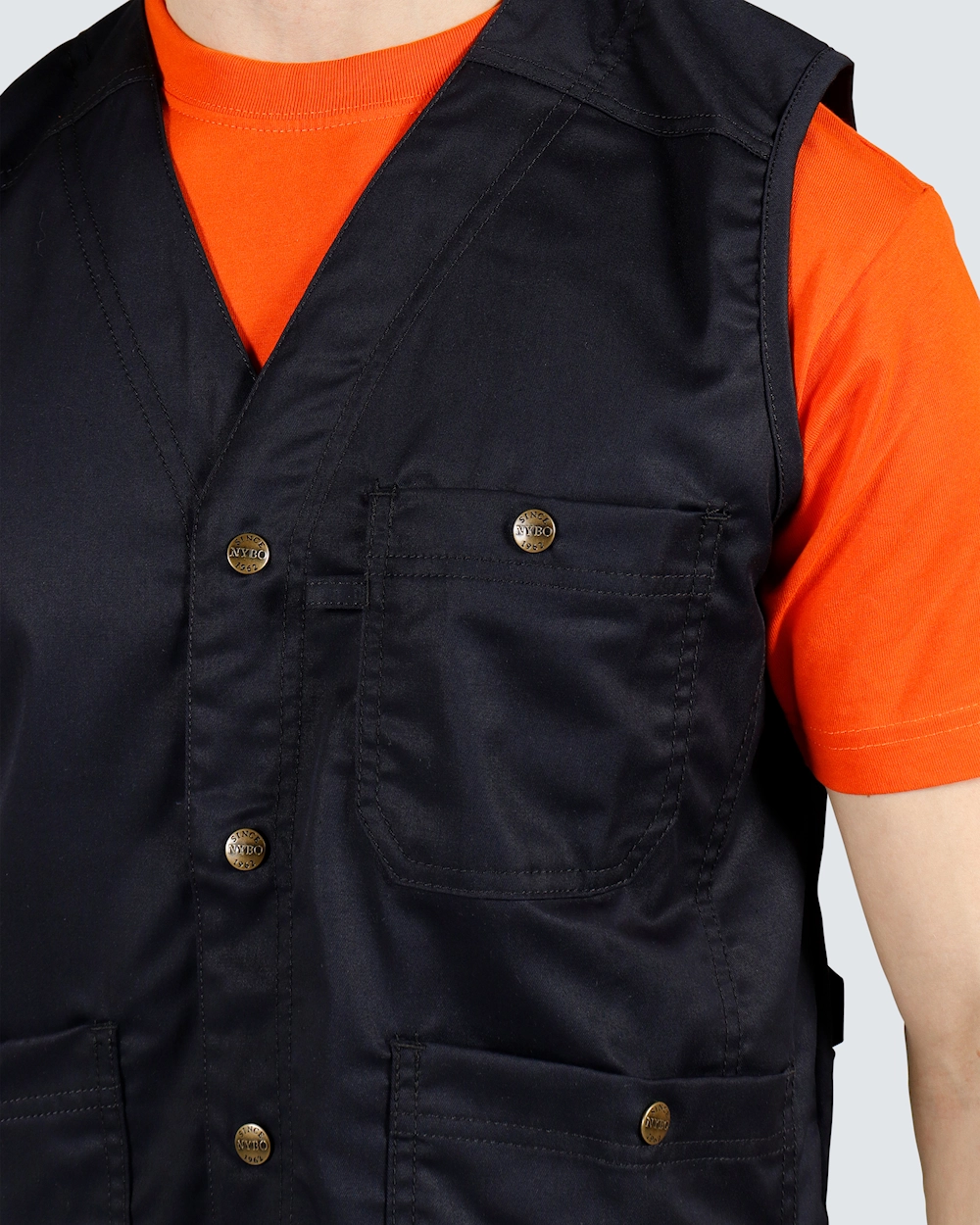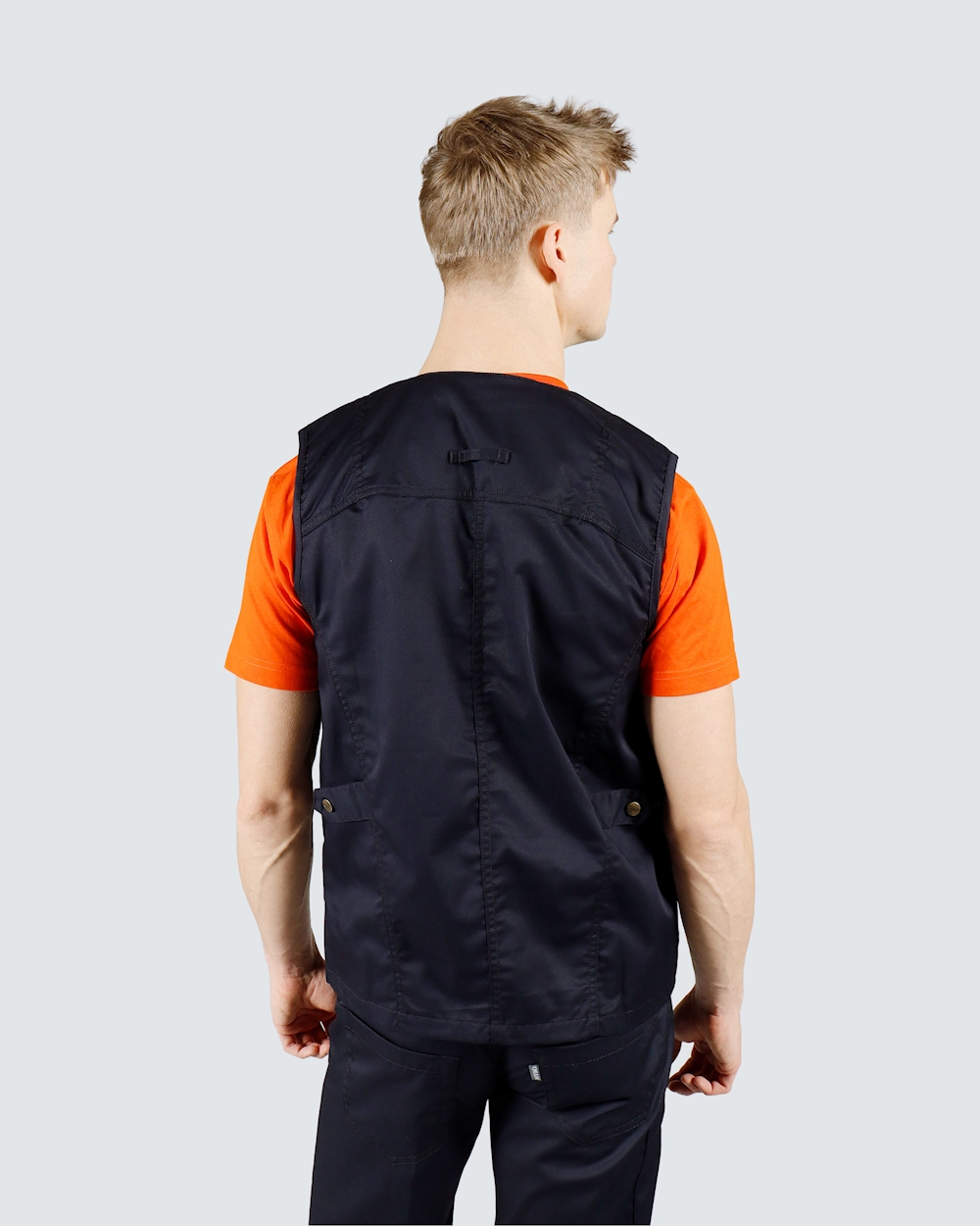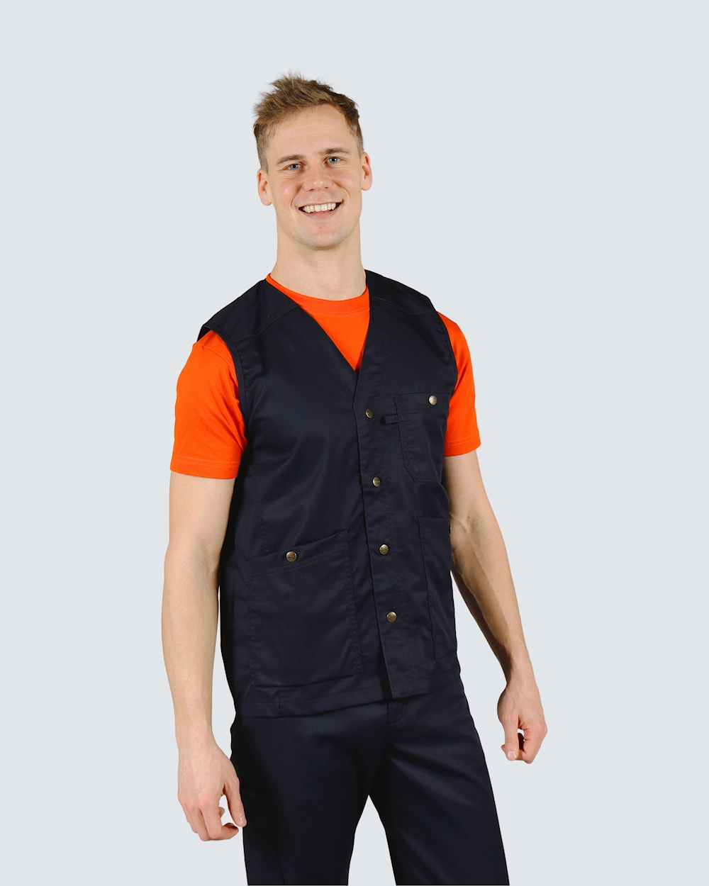 Moderne unisex-vest med praktisk trykknaplukning og generøse lommer - to hoftelommer, der kan lukkes, og en brystlomme. Stoffet består af stretchfibre af høj kvalitet, der er designet til at holde selv i industrielt vaskeri. Den bløde, strækbare tekstur er kombineret med en tidløs mørk farve, der passer perfekt til arbejdsbeklædning inden for sundhed og service.