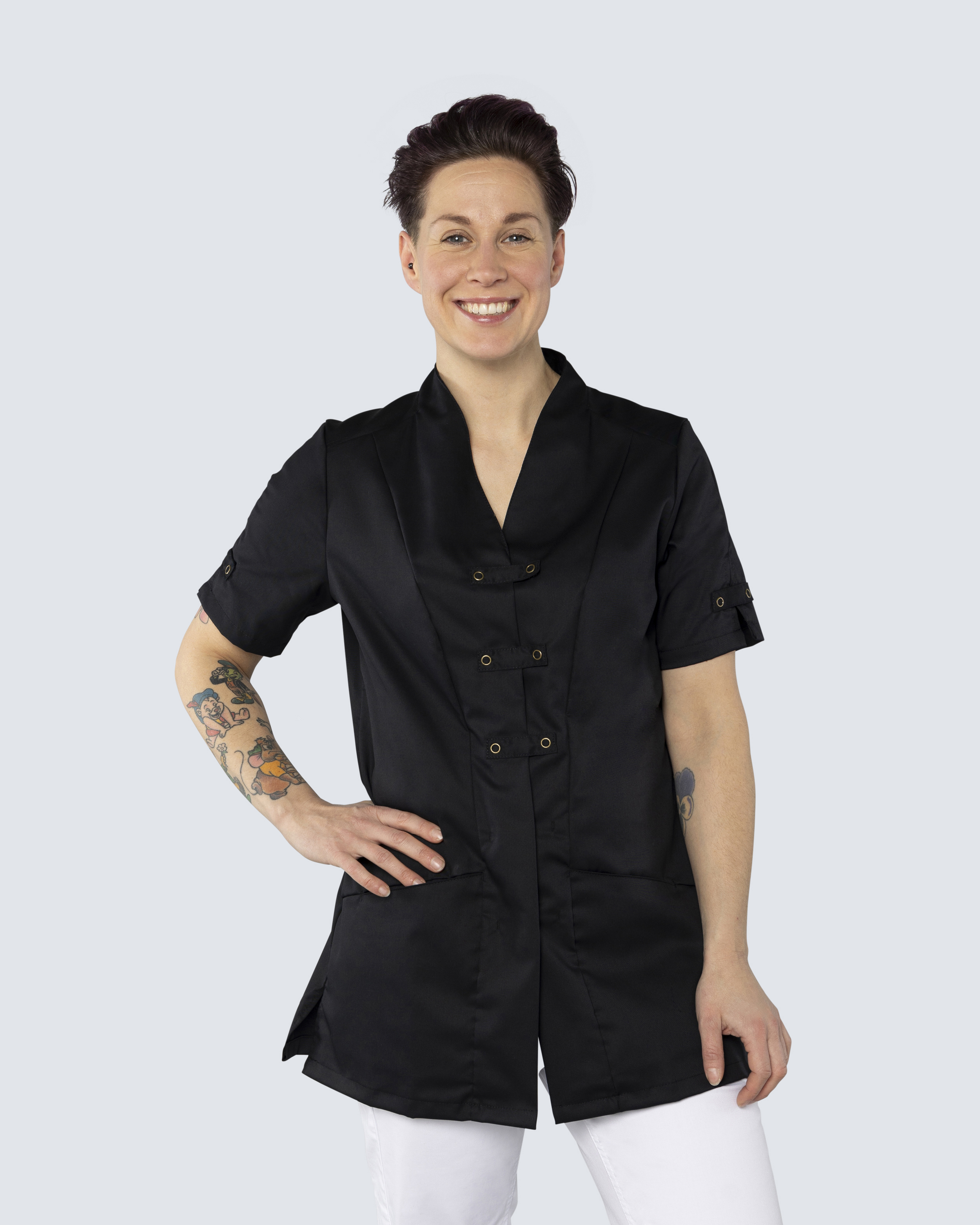 Nybo tunikaen Wellness er den perfekte kombination af elegance og funktionalitet. Med en stilfuld asiatisk-inspireret trykknaplukning foran og en ren krave giver denne tunika til kvinder et sofistikeret look. Praktiske hoftelommer med skjulte snore gør det nemt at holde styr på vigtige arbejdsredskaber.