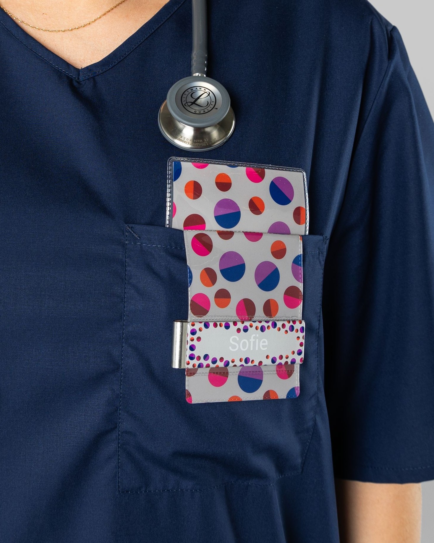 En farverig kuglepenslomme i plast, der sikrer, at dine kuglepenne ikke forsvinder, samtidig med at du beskytter dine beklædningsgenstande mod blæklækage. En god måde altid at have en kuglepen tæt ved hånden. På forsiden af lommen til kuglepennen er en lomme til navneskilt.