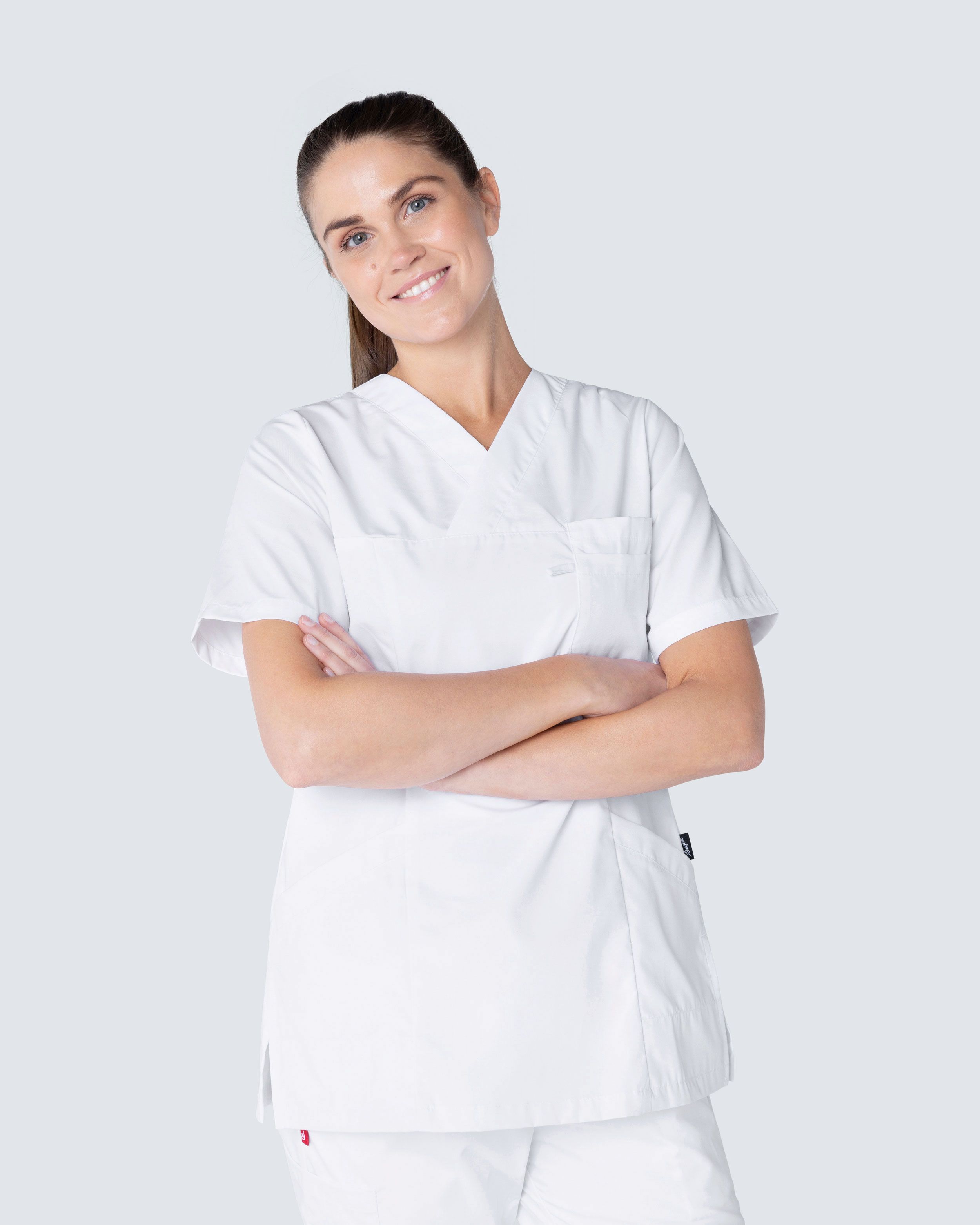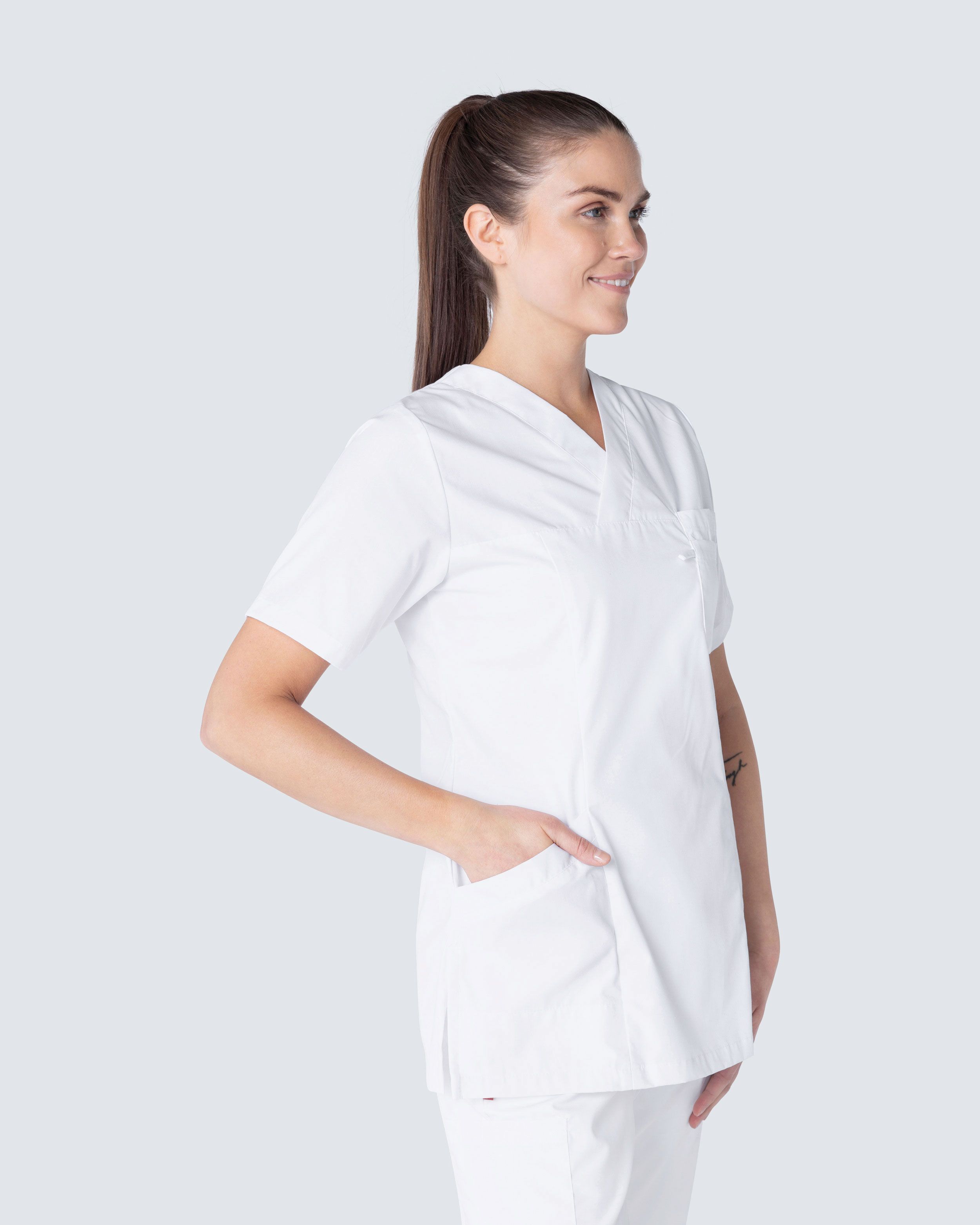 Plejetunikaen er lavet af 50% bomuld og 50% polyester, hvilket giver både høj holdbarhed, kvalitet og komfort. Tunikaen er certificeret i henhold til OEKO-TEX og er dermed helt fri for usunde kemikalier.