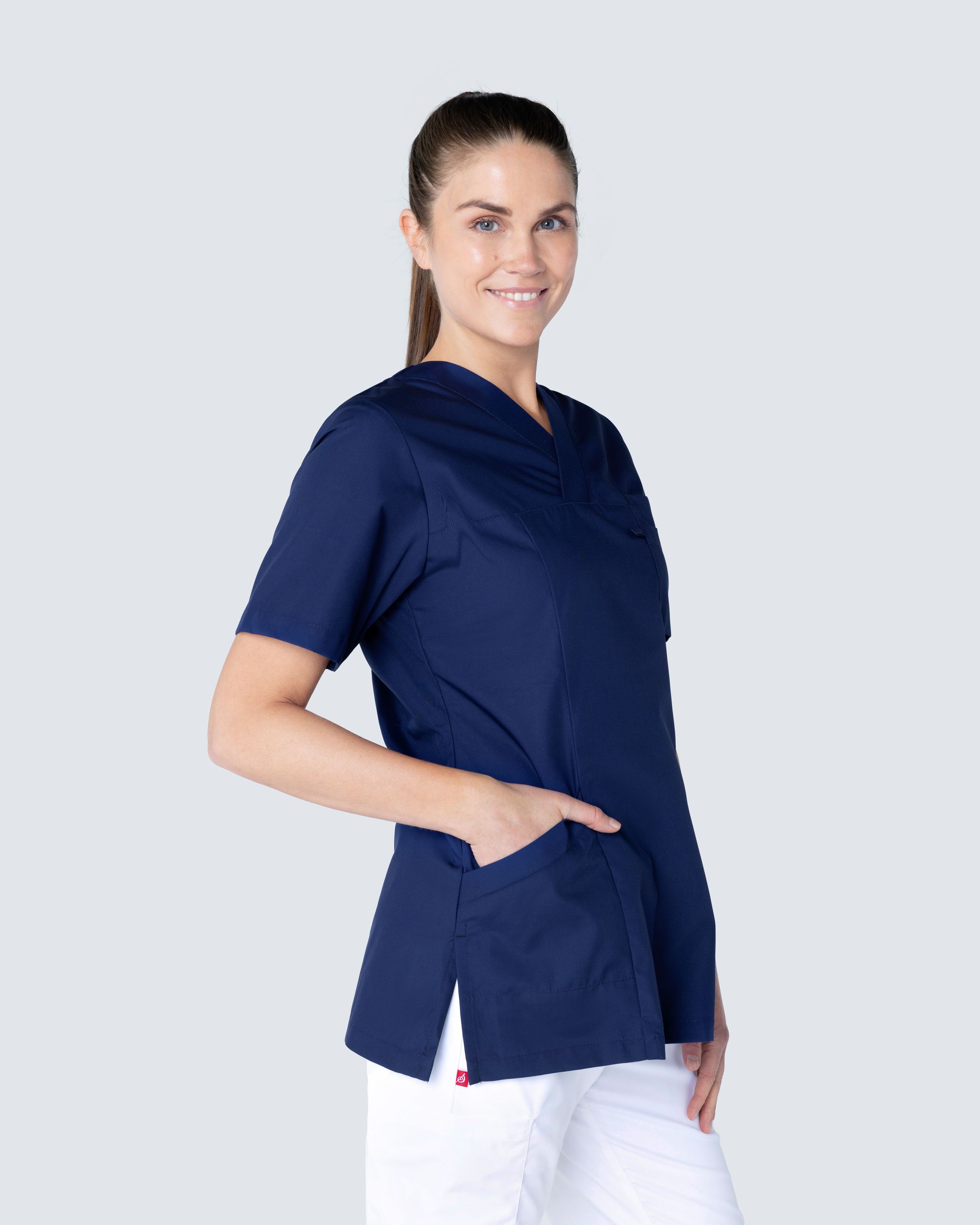 Behagelig og fleksibel tunika med V-udskæring fra Segers. Tunikaen er udrustet med flere gode funktioner for at lette arbejdet. Tunikaen har en brystlomme med dobbeltfunktion og to skrå sidelommer med dobbelt stof for øget holdbarhed. I højre lomme finder du også en telefonlomme og nøglering, hvor du nemt kan fastsætte dine nøgler eller ID-kort. Med et slids i siderne får du optimal komfort og bevægelsesfrihed.