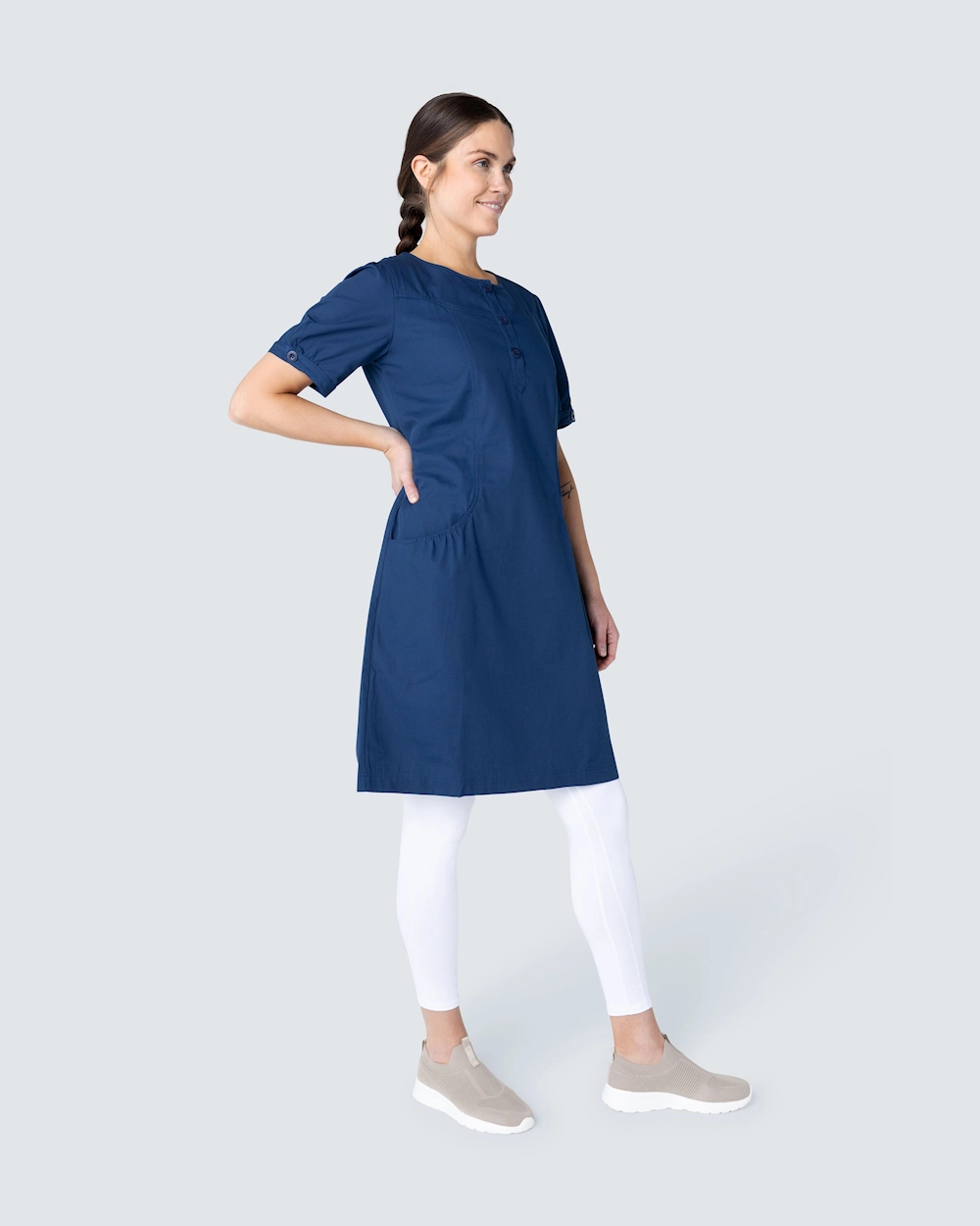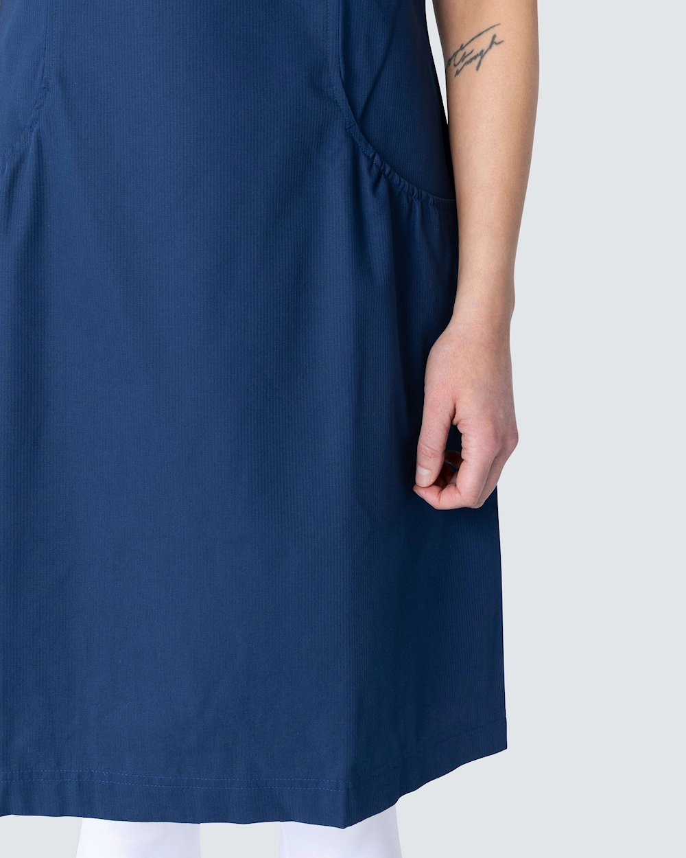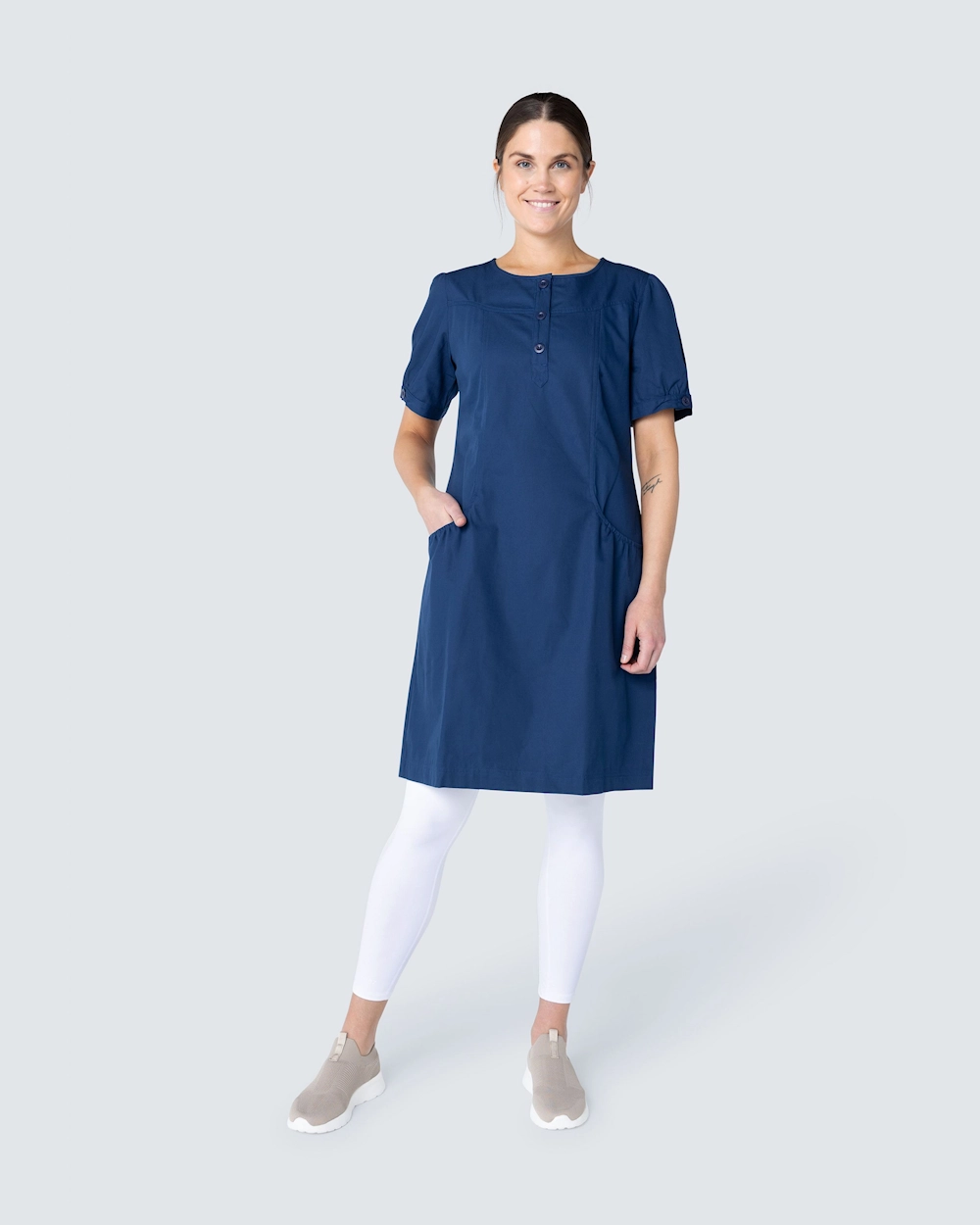 Detaljeret kjole med strik, knapper og rynker øverst i lommerne.