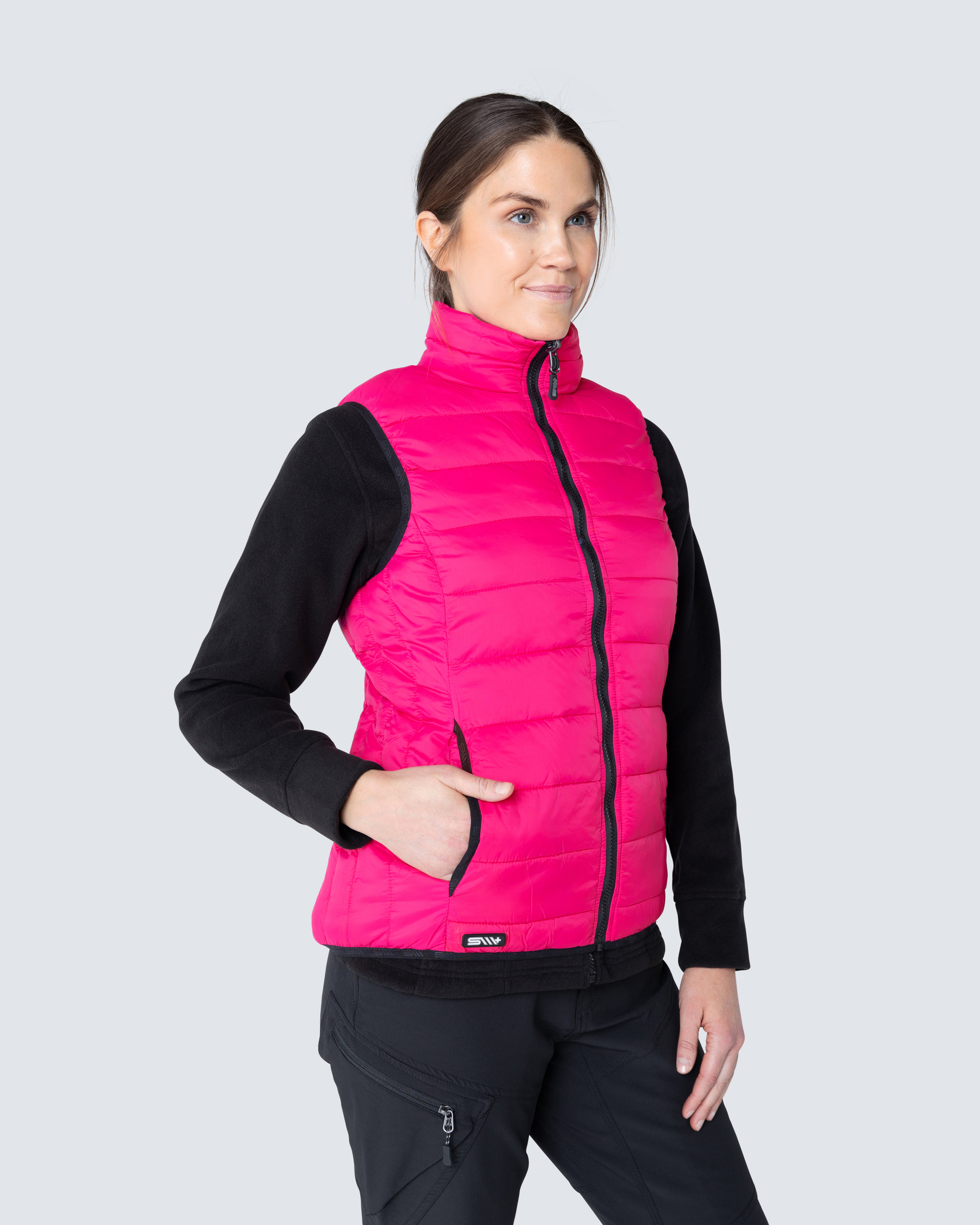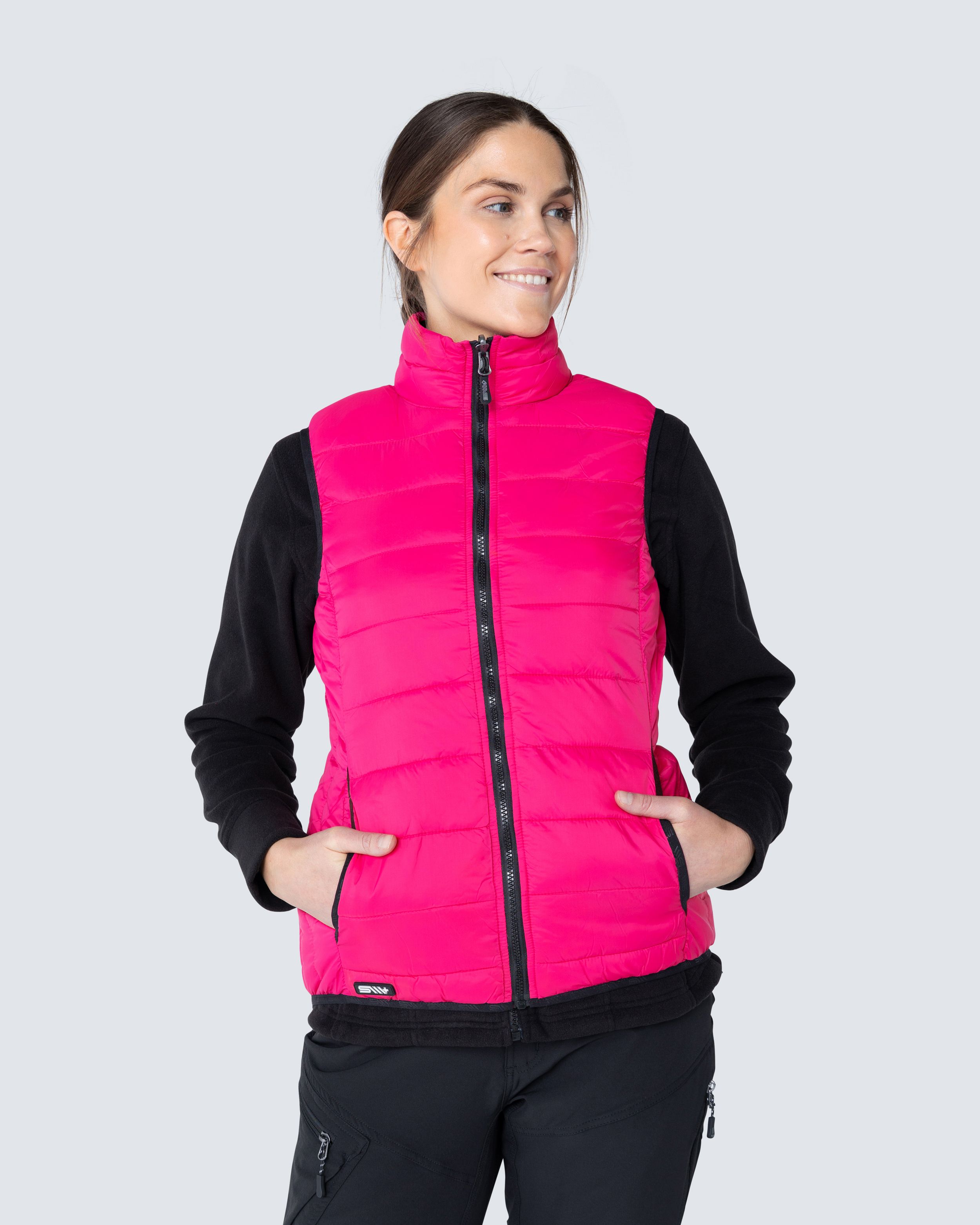 Letvægtsvest med faux dun og figurnær pasform. Dunet holdes på plads gennem vestens smalle kanaler. Vesten leveres med sorte lynlås-skyder, der kan ændres, hvis det er nødvendigt. Der medfølger en taske med ekstra lynlås-skydere i samme farve som vesten.